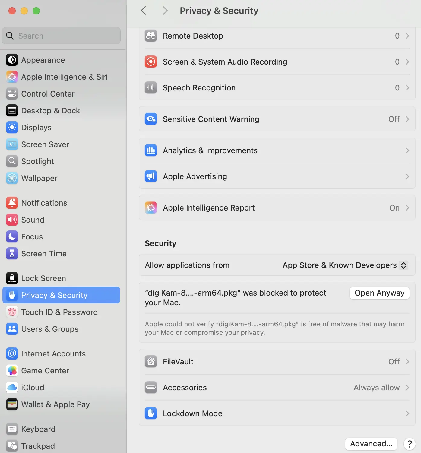 Cal permetre que l'instal·lador s'executi fent clic a Obre de totes maneres en el diàleg Configuració del sistema/Seguretat i privadesa del macOS (desplaceu-vos cap avall per a veure la secció Seguretat).