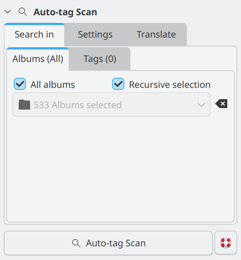 La pestanya Cerca a permet triar quins àlbums i etiquetes d'imatge s'inclouran en una exploració. Podeu seleccionar àlbums o etiquetes específiques per a l'etiquetatge automàtic.