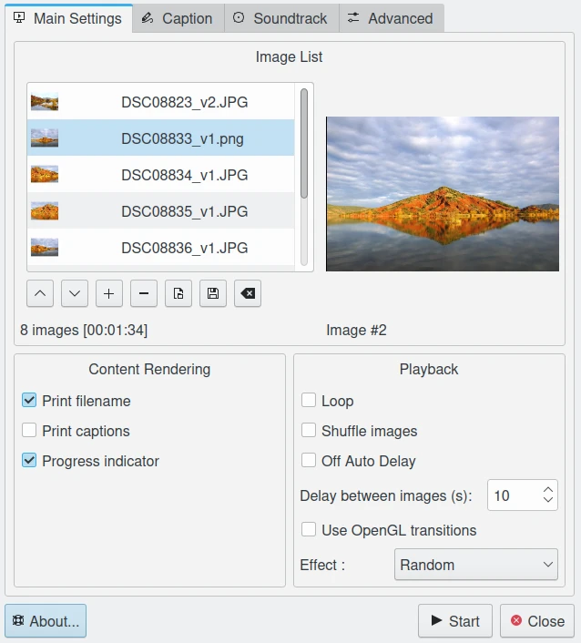 Hi ha més d'una dotzena d'Efectes de transició disponibles per a triar. La selecció Aleatòria canviarà l'efecte de transició amb cada imatge.