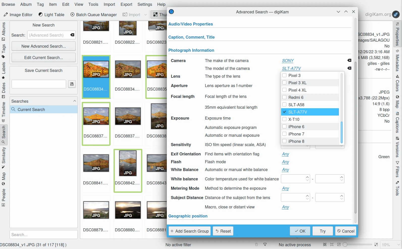 A Ferramenta de busca avançada do digiKam localizando vários itens no banco de dados por propriedades de fotografia¶