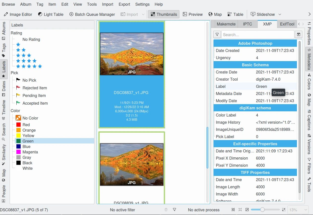 Outra categorização pode ser orientada por tarefas, como em trabalhos de impressão, exportação web, pessoal, galeriaXYZ, clientes, apresentação de slides, etc. Crie grupos conforme necessário, mas não mais do que o necessário. Você deve se lembrar de todas as suas etiquetas de nível superior, caso contrário, as diferenciações serão inúteis. Não se esqueça de que você tem todos os outros atributos para refinar a busca. O filtro de etiquetas da barra lateral direita combina com qualquer vista da barra lateral esquerda (álbuns, datas, linha do tempo, etiquetas e pesquisa). As categorizações de fluxo de trabalho também podem ser facilmente atribuídas a Rótulos de cor no digiKam.