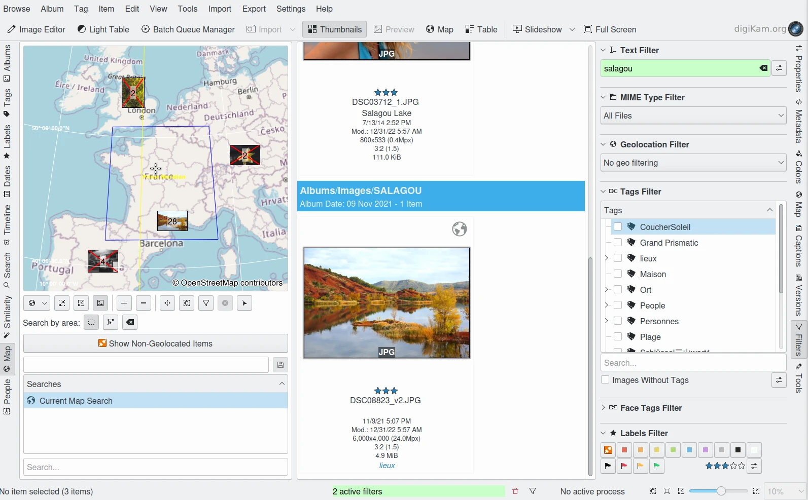 O digiKam oferece diversos métodos para classificar fotografias: nomes de arquivos, álbuns, coleções, carimbo de data/hora, etiquetas, classificação, posição GPS e legendas. Como se não bastasse, você pode pesquisar usando a maioria dos itens de metadados padrão, como modelo da câmera, lente, coordenadas, tamanho da imagem e muito mais. As categorias de metadados listadas aqui são, na verdade, diferentes visualizações da sua biblioteca de fotos. Combinar essas visualizações é um método muito poderoso para refinar uma busca e encontrar um arquivo rapidamente. Imagine ter 800 fotos da sua pessoa amada. Pesquisar por Salagou, com mais de 3 estrelas de classificação, tiradas na França, certamente deixará você com pouquíssimos candidatos. Comparado à maioria dos outros sistemas de DAM, os recursos de busca e seleção do digiKam são completos, versáteis, rápidos, escaláveis, precisos e baseados em padrões abertos.