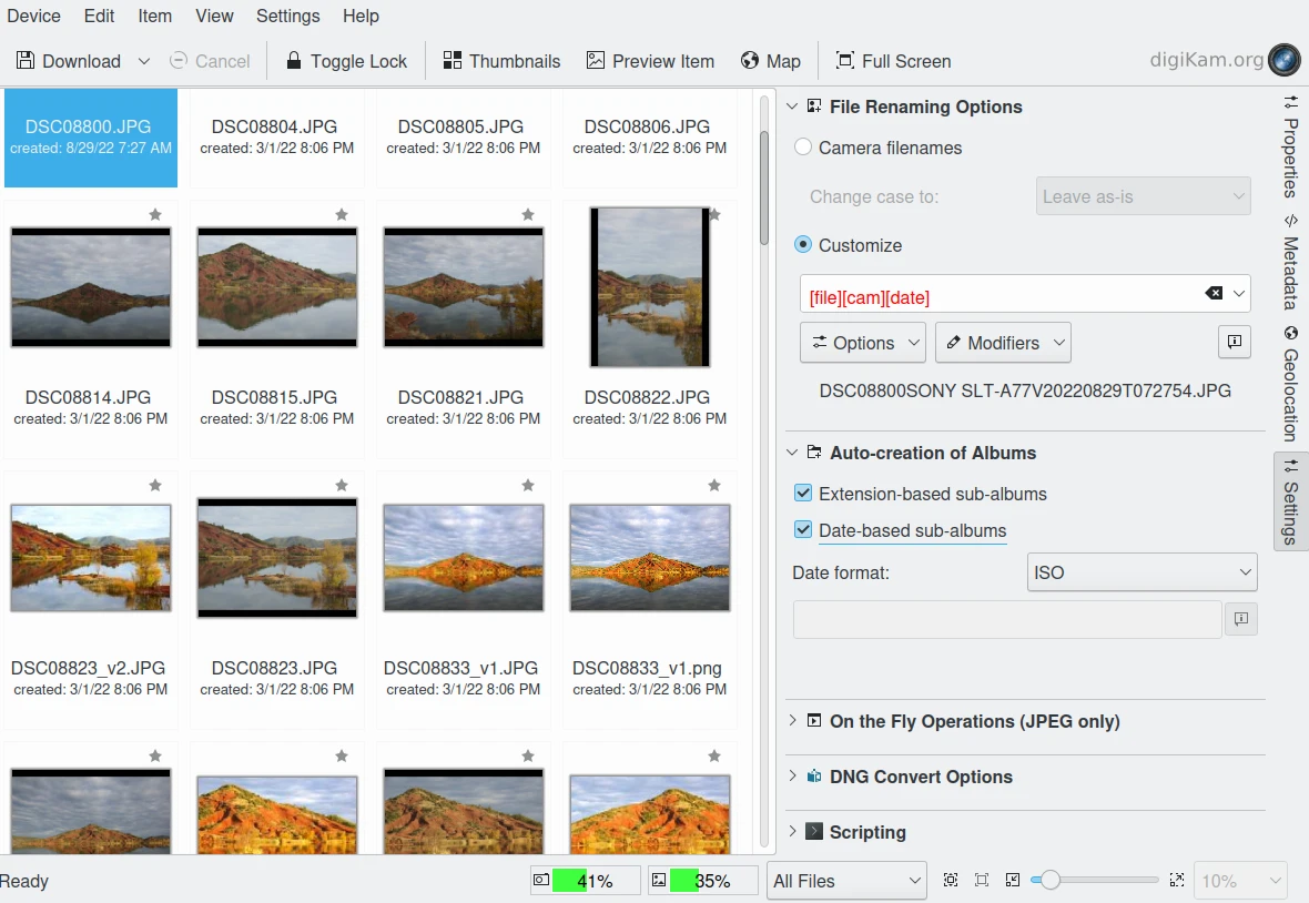 A Ferramenta de importação do digiKam permite que você crie álbuns e renomeie arquivos com base nas propriedades dos itens¶
