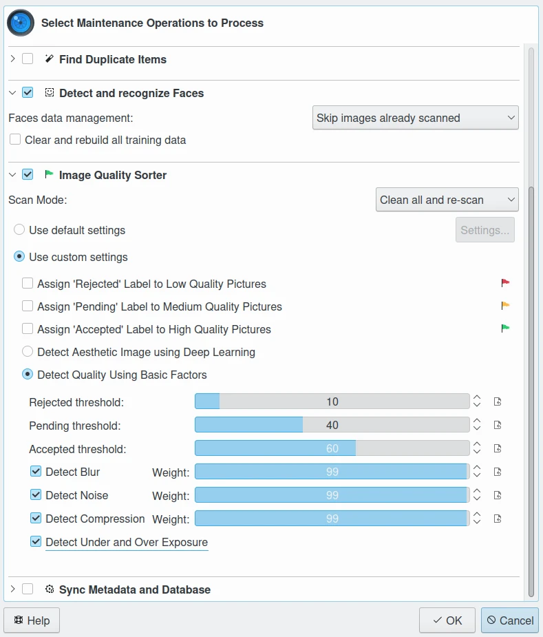 A ferramenta de manutenção do digiKam é a melhor maneira de marcar itens automaticamente por Qualidade ou por Rostos¶