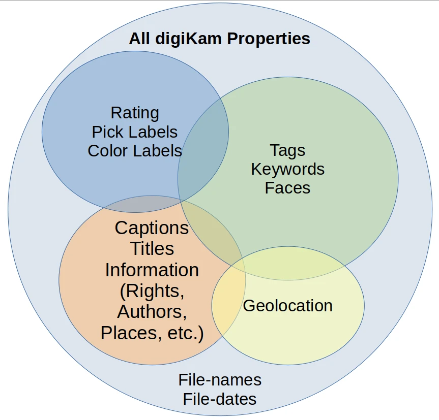 O gráfico abaixo mostra como diferentes propriedades de itens do digiKam se sobrepõem. Esta é uma representação muito grosseira, pois cada bloco de metadados será subdividido em várias seções. Os dados Nomes de arquivo e Datas de arquivo são propriedades de todas as imagens, obtidas do sistema de arquivos, se necessário.