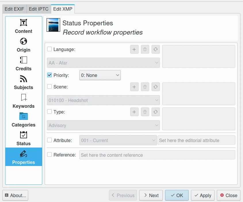 As diferentes propriedades de itens disponíveis no digiKam¶