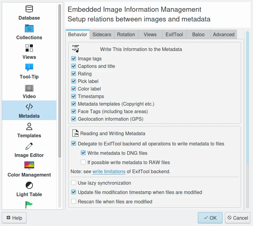 Também recomendamos ativar a opção Gravar metadados na página de configurações do digiKam para metadados. Isso garantirá que as informações Exif, IPTC e XMP sejam gravadas no arquivo. Caso tenha esquecido de fazer isso, você sempre pode recuperar o atraso copiando os metadados do banco de dados para os arquivos de uma só vez (no menu Álbum).
