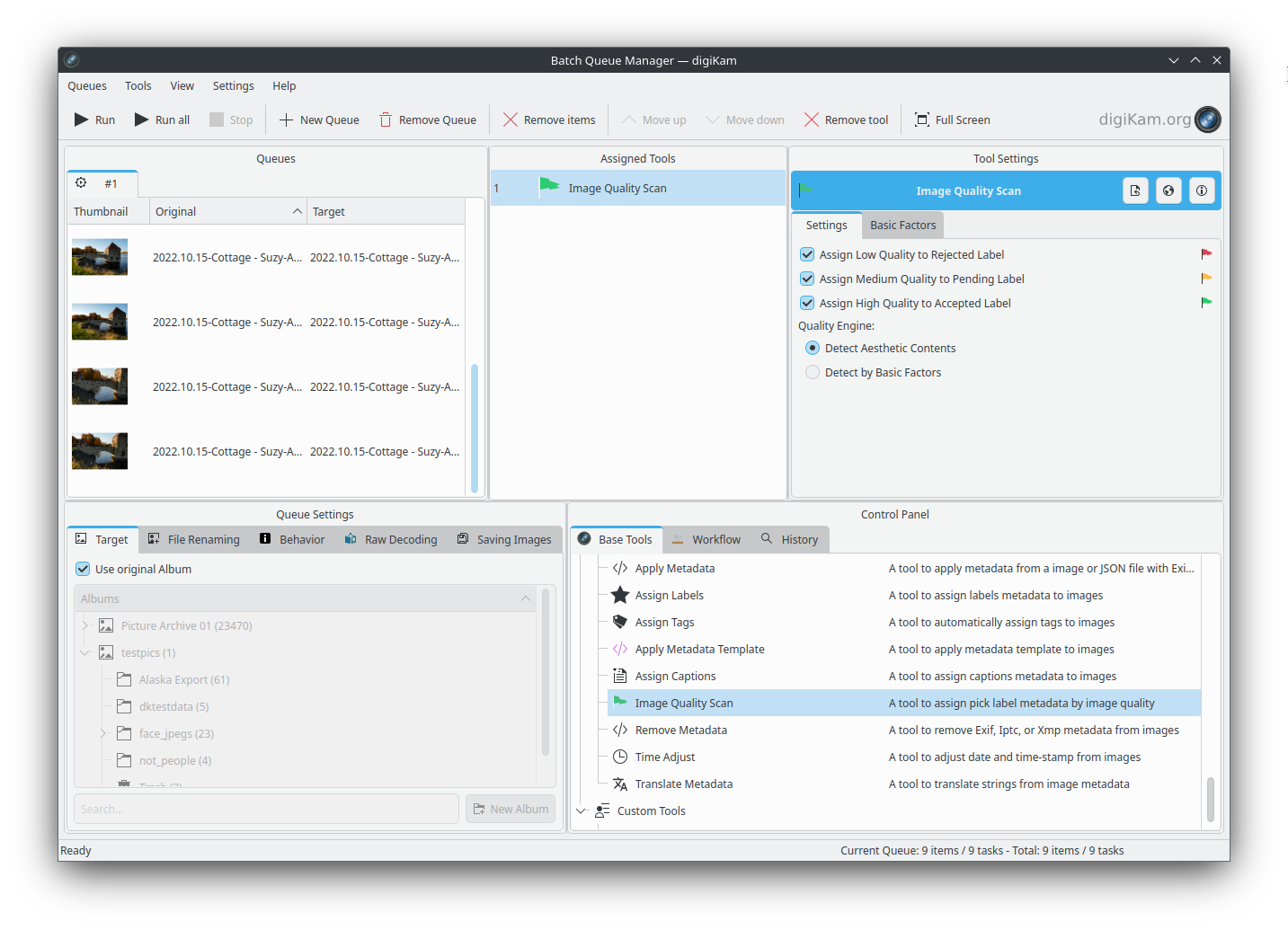 Outro recurso do digiKam são os Rótulos de seleção, usados para categorizar fotografias por qualidade e identificar qual item será Rejeitado, Pendente ou Aceito no seu fluxo de trabalho. Você pode atribuir essas propriedades manualmente, é claro, mas há uma solução melhor: o digiKam pode realizar automaticamente a análise da qualidade da imagem usando uma ferramenta baseada em aprendizado profundo chamada de Analisador de qualidade de imagem. Essa ferramenta avalia características da imagem, como ruído, desfoque, forma, conteúdo, etc., e fornece uma avaliação da qualidade da foto. Essa ferramenta está disponível na Vista dos rótulos, no Menu de Manutenção e no Gerenciador de processamento em lote.