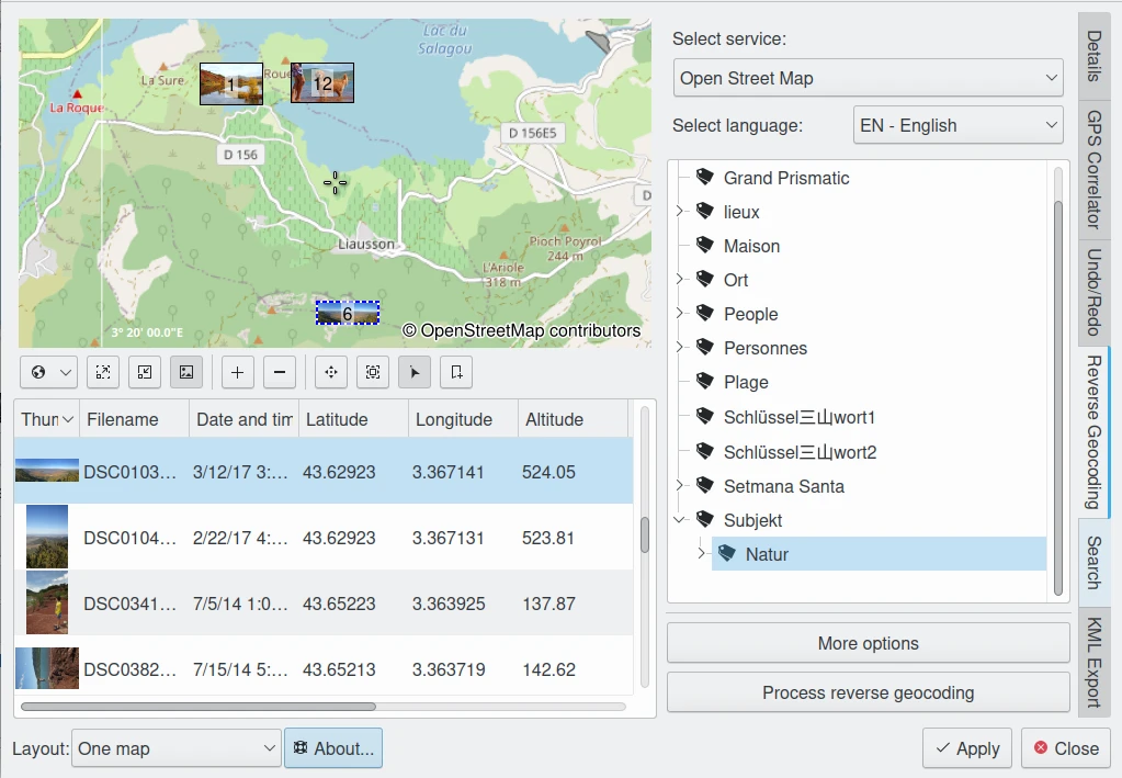 Você pode então combinar automaticamente um conjunto de fotos com os dados de rastreamento GPS usando o digiKam. As coordenadas são gravadas na parte JFIF dos arquivos JPG, dependendo das suas configurações, e no banco de dados. Fornecidas imagens georreferenciadas, o digiKam suporta buscas baseadas em localizações e coordenadas. Você pode até criar álbuns virtuais baseados em áreas geográficas! Na barra lateral direita, abaixo da aba de metadados, você encontrará suas imagens localizadas em um mapa-múndi com zoom e rolagem. Um clique adicional permite que você use qualquer um dos vários serviços de mapeamento na web, ampliando os detalhes. Mesmo que você não tenha uma trilha de GPS, você pode georreferenciar várias imagens com um editor geográfico. Basta navegar no mapa e clicar no local onde as imagens foram tiradas para georreferenciar as imagens.