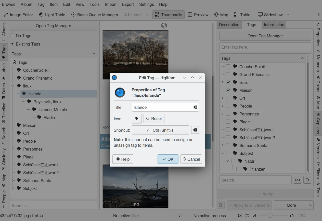 De qualquer forma, você precisa criar uma estrutura de etiquetas adaptada ao seu caso de uso. Você pode configurar o digiKam para gravar toda a hierarquia de etiquetas em campos XMP, para que sua agência fotográfica possa usar qualquer aplicativo que desejar para criar automaticamente Títulos e Legendas para exportação para a web com base nas etiquetas embutidas. Ou você pode simplesmente adicionar palavras-chave para encontrar rapidamente uma imagem específica.