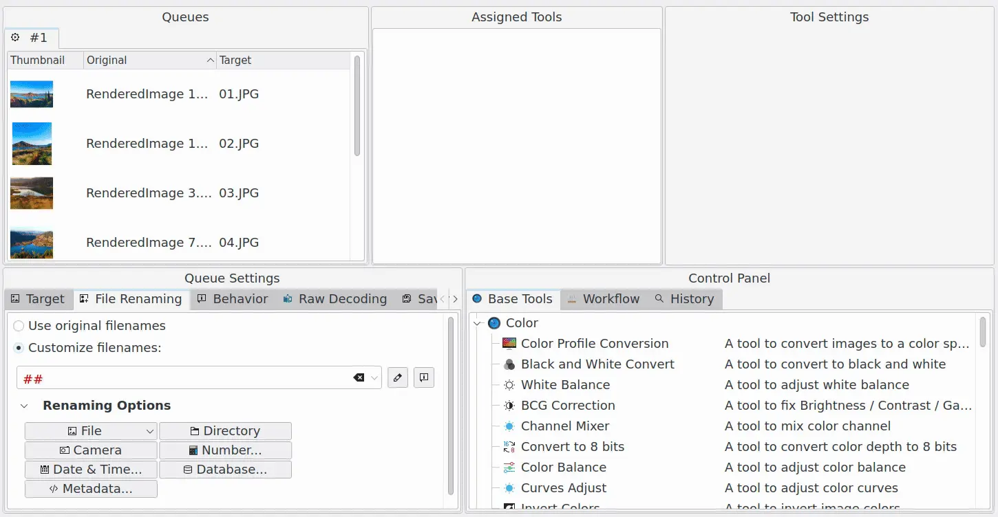 As Configurações da fila no canto inferior esquerdo da janela mostram todas as configurações da fila selecionada. Elas incluem onde salvar os arquivos de destino, regras de renomeação de arquivos, comportamentos gerais para o manuseio de arquivos, configurações para processamento de arquivos RAW e configurações de imagem para os arquivos de destino. A visualização de renomeação de arquivos é basicamente a mesma da ferramenta Renomeação avançada disponível na Janela principal. Veja a descrição completa nesta seção deste manual.