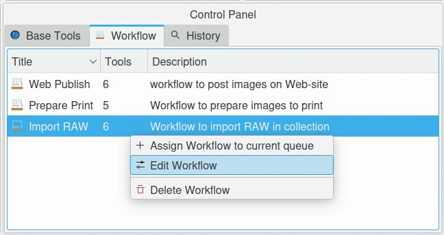 O gerenciador de processamento em lote possui uma aba chamada Fluxo de trabalho no canto inferior direito da janela, que está vazia por padrão. Essa visualização é uma lista onde o usuário pode armazenar o conjunto de ferramentas preferido para atribuir às filas. Essa lista é salva e restaurada entre as sessões, permitindo que os fluxos de trabalho sejam reutilizados.