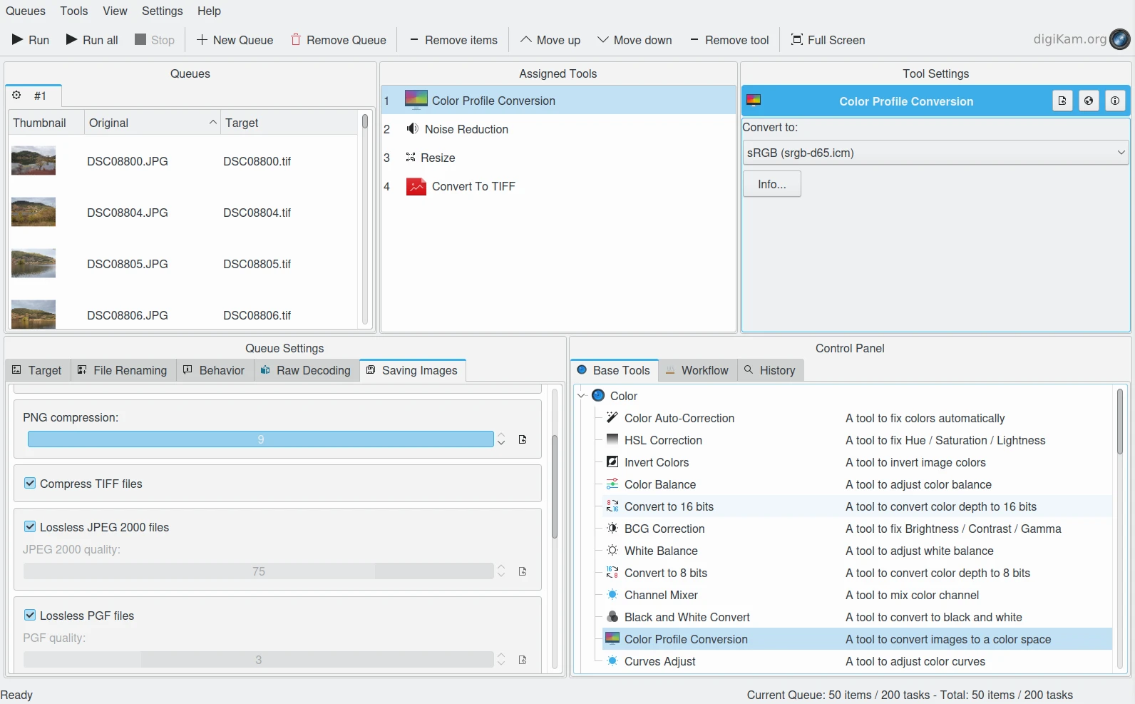 O Gerenciador de processamento em lote do digiKam permite converter espaços de cor em lote¶