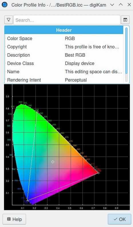 A janela de propriedades do perfil de cor do digiKam exibindo informações do BestRGB¶