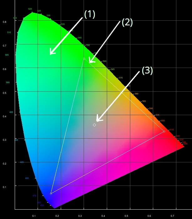 O triângulo de Gamute (2) define o intervalo de cores RGB que o perfil abrange. Em outras palavras, o espaço de cor só pode representar cores dentro desse triângulo. As cores primárias RGB definem os vértices do triângulo. O ponto vermelho está no canto inferior direito, o verde está no canto superior e o azul está no canto inferior esquerdo.