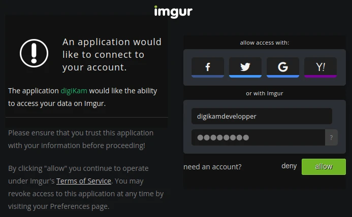 Para conectar-se a uma conta, clique no botão Enviar. Você será conduzido pelo processo de obtenção de um token, que será usado para fins de autenticação. A seguinte janela será exibida e uma janela do navegador será aberta para que você possa fazer login no Imgur: