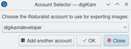 Na parte superior da visualização de configurações, você pode ver as propriedades da Conta de login usada para se conectar ao iNaturalist. Você pode alternar para outra conta usando o botão Alterar a conta. O botão Remover conta permitirá que você exclua as informações de conta usadas pelo digiKam para se conectar automaticamente ao servidor.