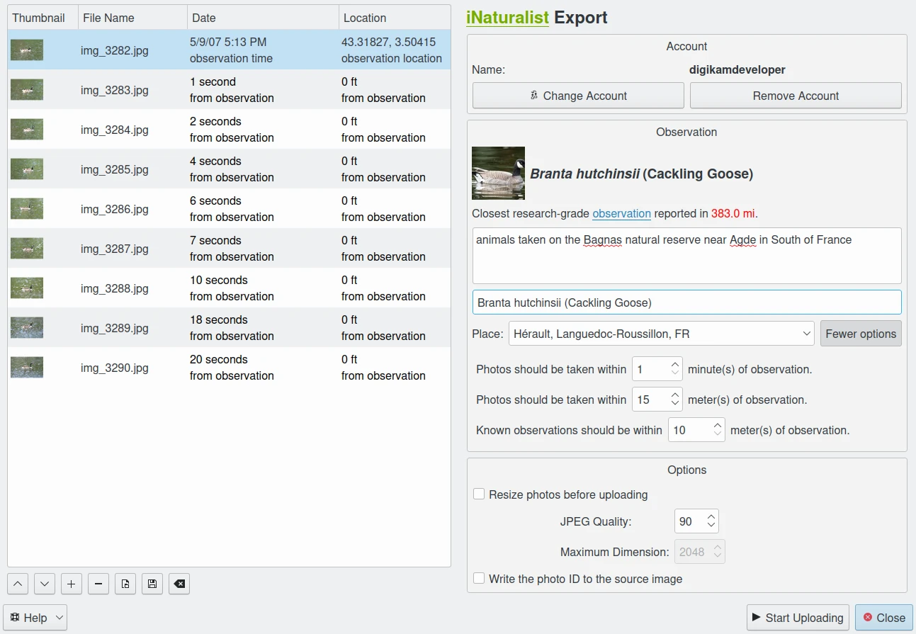 Uma opção especial está disponível para Gravar a identificação (ID) da foto na imagem de origem. O número de identificação usado para fazer o upload para sua conta do iNaturalist será registrado nos metadados XMP do arquivo em sua coleção.