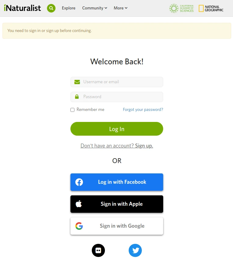 A página da web do iNaturalist para fazer login na sua conta¶
