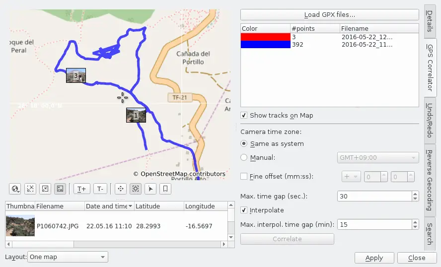 Para correlacionar suas imagens com dados geográficos, você precisa ter informações de rastreamento GPS disponíveis como um arquivo XML no formato GPX (o gpsbabel pode baixar e converter dados de rastreamento de um dispositivo GPS para você). A ideia é levar um pequeno dispositivo GPS com você para que ele funcione e registre sua posição enquanto você tira as fotos. Quando terminar, baixe as fotos e o arquivo de rastreamento do GPS e execute o correlacionador para encontrar os carimbos de data/hora do arquivo de imagem no arquivo de rastreamento do GPS e marcar as fotos com os locais corretos.