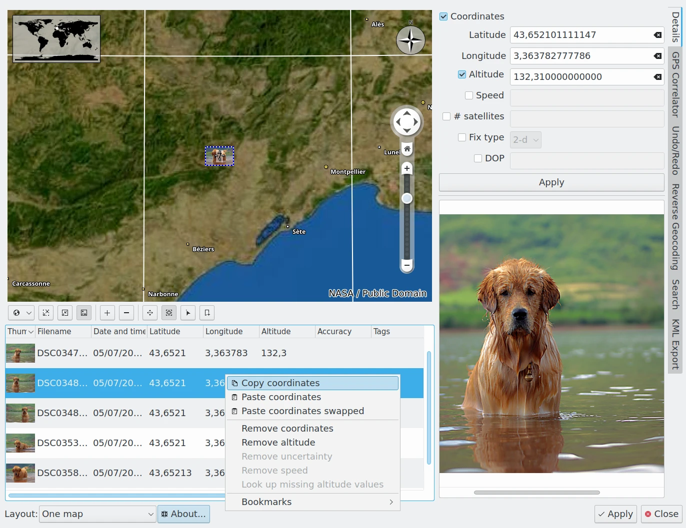 As coordenadas podem ser definidas manualmente na aba Detalhes. A localização pode ser encontrada e ajustada iterativamente usando o mapa exibido. Mova o cursor do mouse para a região de interesse, amplie, ajuste manualmente a localização, amplie novamente e assim por diante até obter precisão suficiente. Observe que o centro do zoom sempre estará na posição do cursor. Eventualmente, você pode clicar com o botão direito do mouse na posição desejada e escolher Copiar coordenadas. Agora você pode ir para a lista de imagens abaixo do mapa, selecionar uma ou mais imagens, clicar com o botão direito em qualquer uma das imagens selecionadas e escolher Colar coordenadas. As coordenadas serão exibidas nos campos Latitude e Longitude à direita do mapa. Clique no botão Aplicar abaixo do campo DOP na barra lateral direita para aplicar as alterações à última imagem selecionada na lista de imagens. Clique no botão Aplicar abaixo da lista de imagens na parte inferior da janela para salvar suas alterações nas imagens selecionadas.