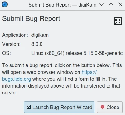 O digiKam facilita ao máximo a comunicação de bugs ou sugestões de melhorias. Onde quer que você esteja no aplicativo, o menu principal incluirá a opção . Isso exibirá uma caixa de mensagem com um link destacado. Clique no link e seu navegador abrirá a página do sistema de relatórios. Todas as informações necessárias já estarão preenchidas, basta seguir as instruções para concluir seu relatório.
