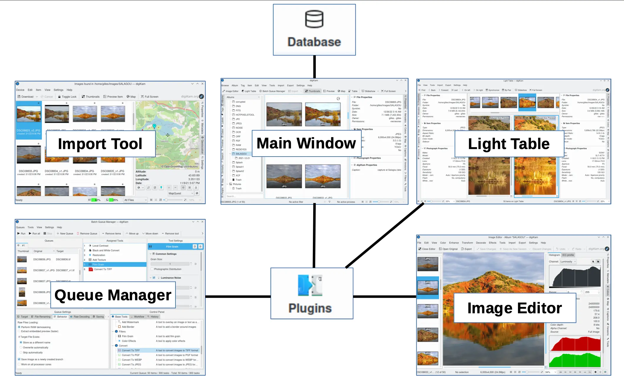 O digiKam é um aplicativo avançado de gerenciamento de fotos digitais para Linux, macOS e Windows. Ele oferece uma interface simples que torna a importação e a organização de fotos digitais muito fáceis. O digiKam permite que você gerencie um grande número de fotos digitais em álbuns, organizando-as para fácil recuperação usando etiquetas (palavras-chave), descrições, coleções, datas e geolocalização. Ele possui diversos recursos para pesquisar, visualizar, organizar, processar e compartilhar suas imagens. Portanto, o digiKam é um formidável programa de Gerenciamento de Ativos Digitais (DAM, em inglês) que também inclui poderosas funções de edição de imagens.