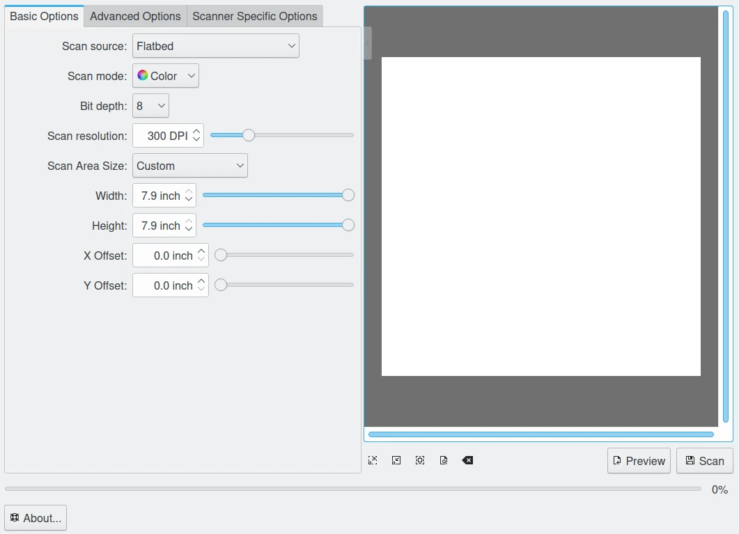 A janela principal apresenta ao usuário três conjuntos de opções: Básica, Avançada e Específica do scanner. A aba Opções básicas contém os parâmetros mais comuns fornecidos pelos backends de scanner do SANE.