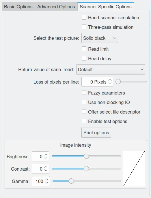 A aba Opções específicas do scanner contém todas as opções específicas do scanner. As opções listadas aqui dependem dos parâmetros SANE suportados pelo seu driver. A caixa de diálogo de importação do scanner deve exibir a maioria dos tipos de parâmetros fornecidos pelo SANE.