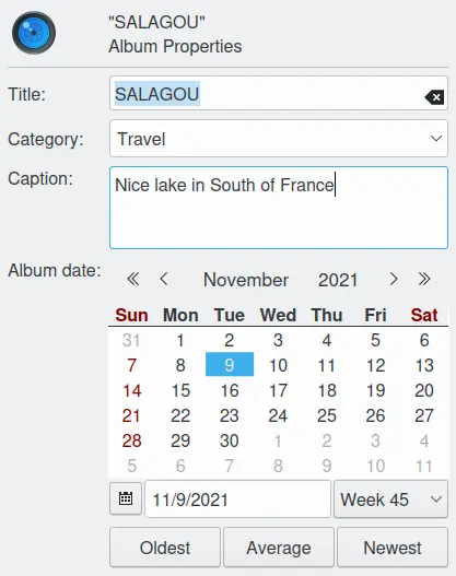 Botões Mais antiga, Média e Mais recente: Eles definirão a Data como a data mais antiga, média ou mais recente das imagens naquele álbum. Primeiro, o programa tentará calcular a data média das imagens no álbum com base nos cabeçalhos Exif. Se isso falhar, o programa retornará à data de modificação dos arquivos naquela pasta.