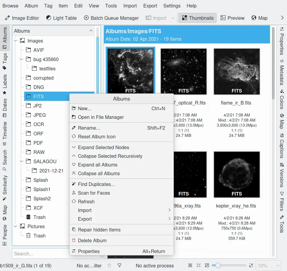 As propriedades do álbum podem ajudar você a lembrar que tipo de fotos estão em um Álbum e também a organizar a árvore de Álbuns. Para acessar as propriedades do álbum, clique com o botão direito do mouse em um álbum e selecione Propriedades Alt+Enter no menu de contexto.