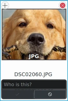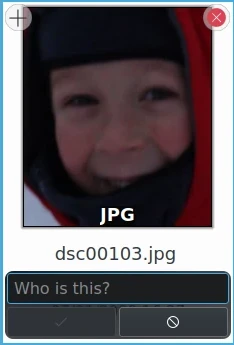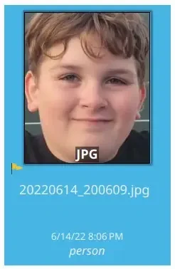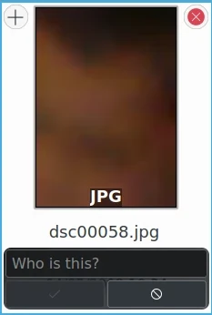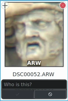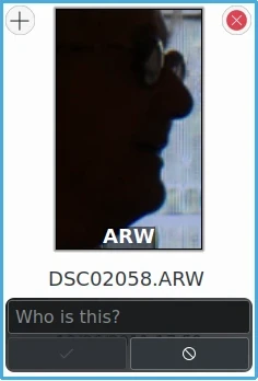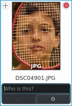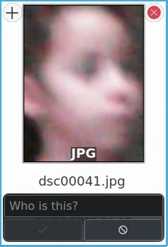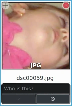 Observe que as miniaturas apresentadas aqui não mostram a imagem inteira. Elas mostram a área da imagem onde o modelo de detecção facial adicionou uma Etiqueta de rosto. Você pode ver a imagem inteira clicando na miniatura. Na visualização que se abre, você verá a imagem inteira com todas as etiquetas de rosto. Caso não as veja, clique no botão de pessoa no canto superior esquerdo da visualização. Se houver mais de uma etiqueta de rosto na imagem, ela também será representada por mais de uma miniatura.