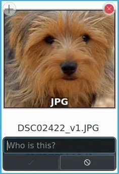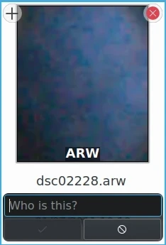Após a confirmação de uma etiqueta de rosto, o digiKam exibe apenas o nome, sem os botões para remover, editar ou confirmar. Se precisar editar ou remover uma etiqueta de rosto confirmada, basta clicar duas vezes no nome e os botões reaparecerão.