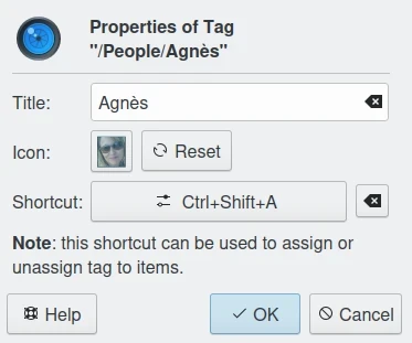 A janela de propriedades da etiqueta de rosto do digiKam com um atalho de teclado atribuído¶