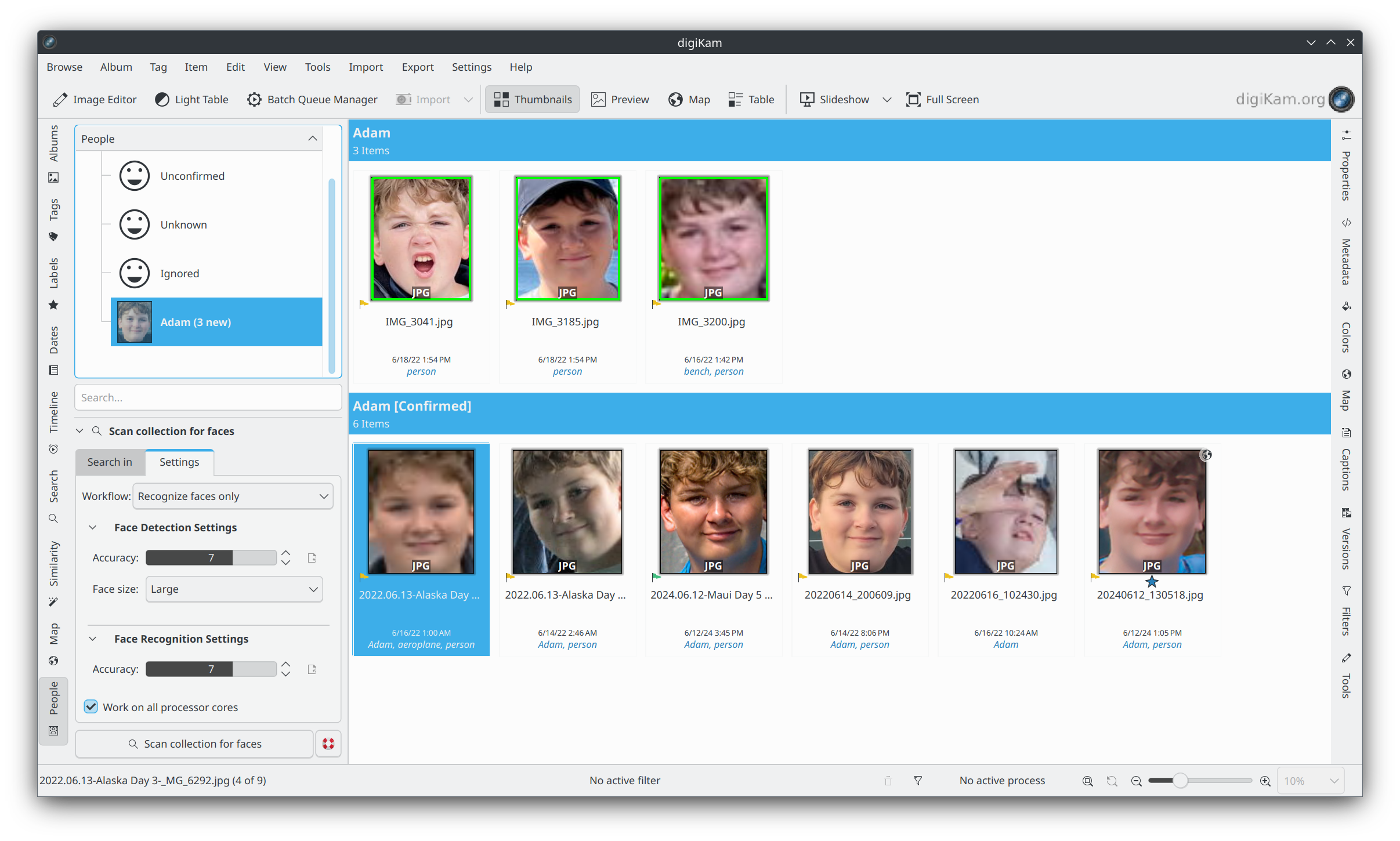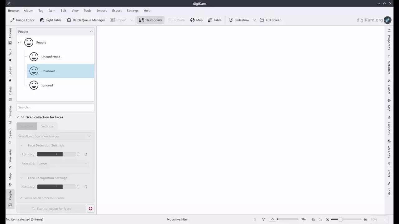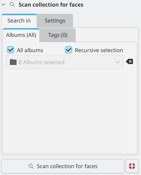 Para Analisar todas as imagens e Analisar novas imagens, o digiKam analisará as imagens selecionadas no filtro em busca de rostos.