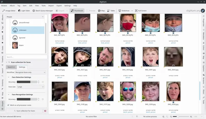 A vista de miniatura do gerenciamento de rosto do digiKam com novos rostos reconhecidos sugeridos como Adam.¶
