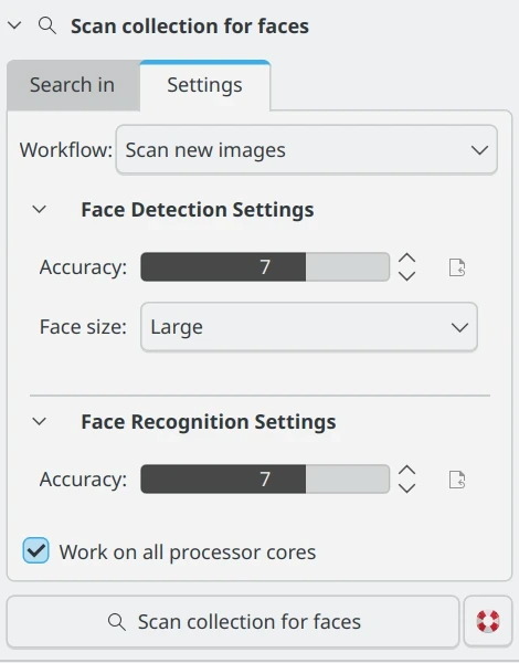 Para detecção de rosto, há duas configurações que o usuário pode ajustar para controlar como o digiKam determina se há um rosto em uma imagem.