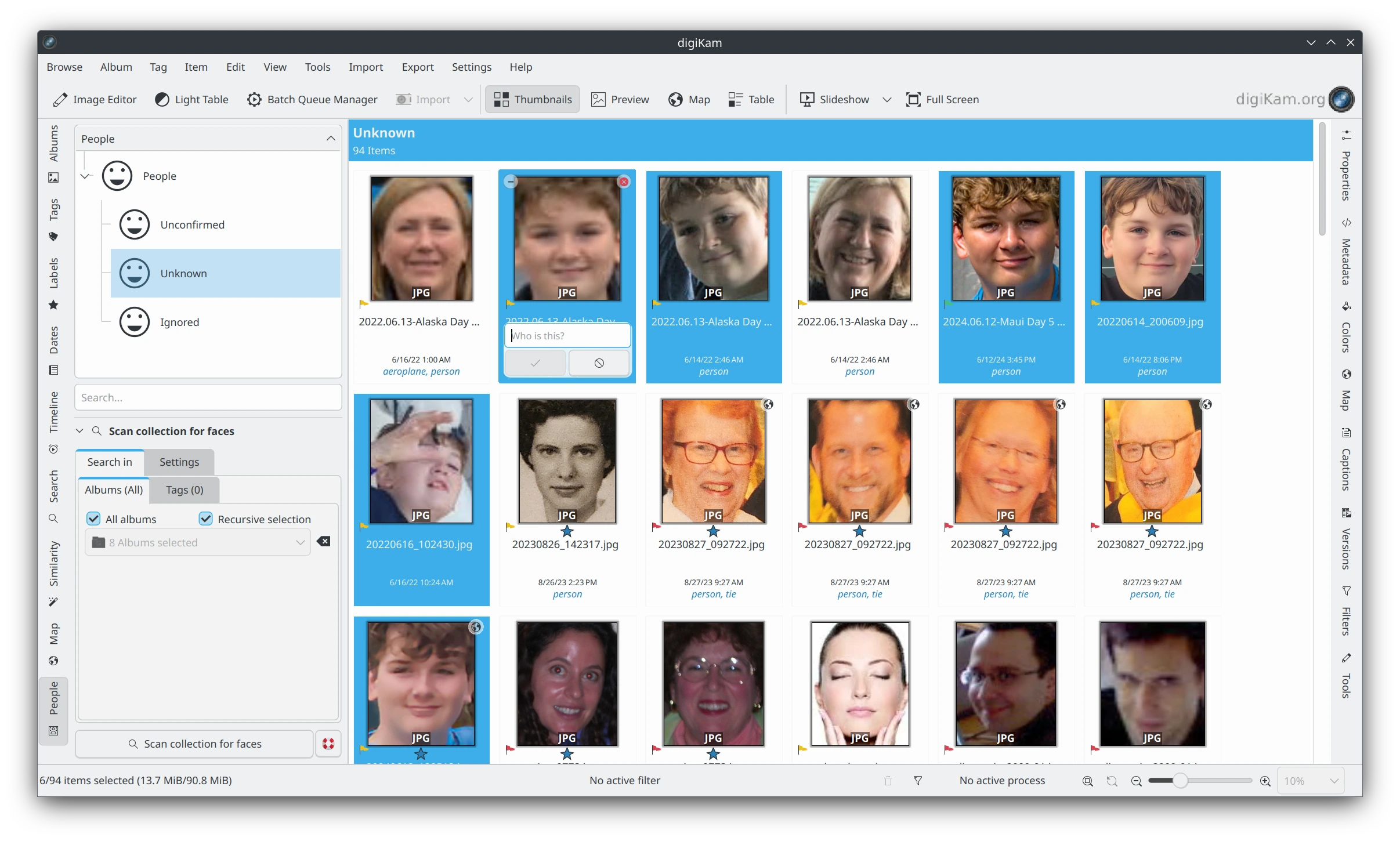 Dependendo do escopo da sua seleção, pode demorar um pouco para que os resultados apareçam na área de imagens. Na lista de etiquetas na barra lateral esquerda, você verá o ramo Pessoas da sua árvore de etiquetas. Para visualizar todo o conjunto de rostos identificados, certifique-se de que a etiqueta Pessoas mais acima esteja selecionada. Você também notará uma nova etiqueta virtual chamada Desconhecido, que inclui todas as imagens em que rostos foram detectados, mas ainda não atribuídos a uma pessoa. Se esta for sua primeira varredura, você também encontrará o conjunto completo de rostos identificados aqui.