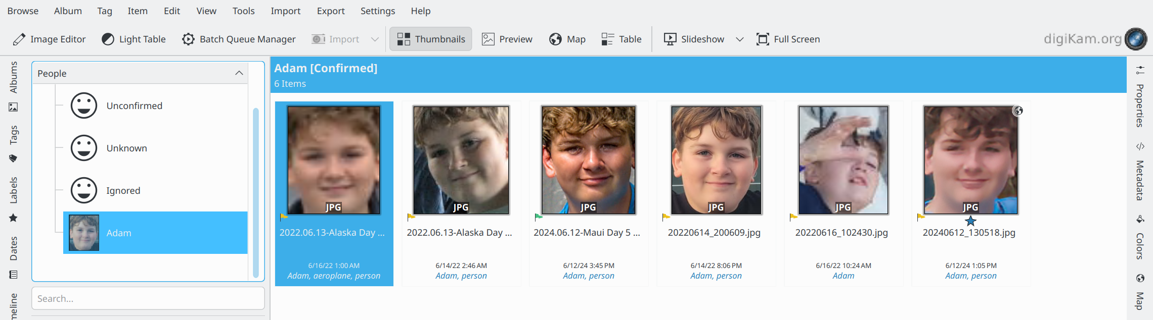 A vista de miniaturas do gerenciamento de rosto do digiKam exibindo um conjunto confirmado de 6 rostos marcados com o nome Adam.¶
