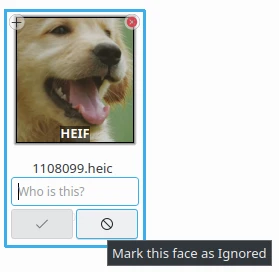Caso haja um rosto que você não queira que seja reconhecido, você pode marcá-lo como ignorado. Isso leva à criação de uma nova etiqueta Ignorado. Isso é reversível; você pode desmarcar o rosto posteriormente, se necessário.