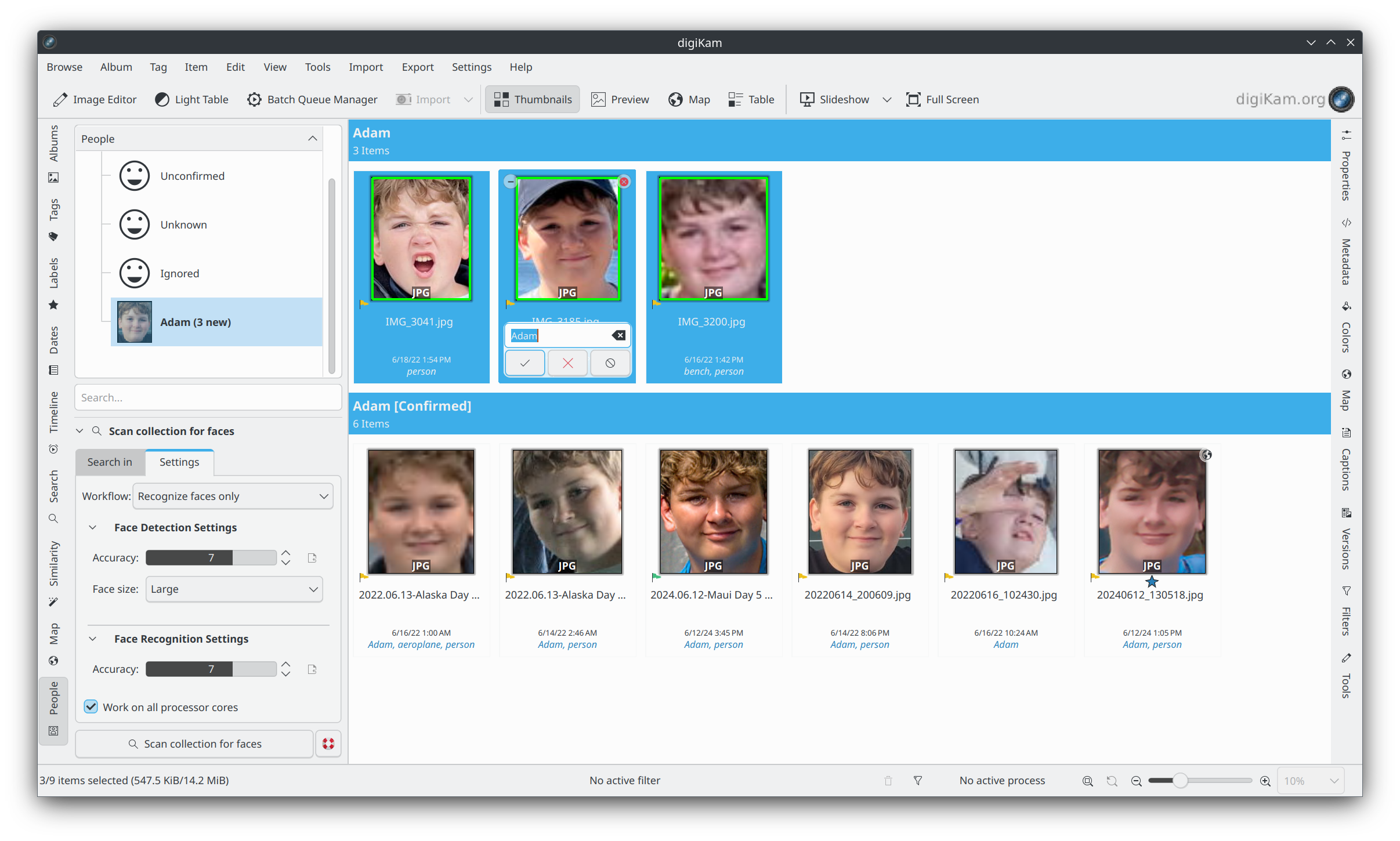Vista em miniatura do gerenciamento facial do digiKam com rostos recém-reconhecidos com uma etiqueta sugerida de Adam.¶