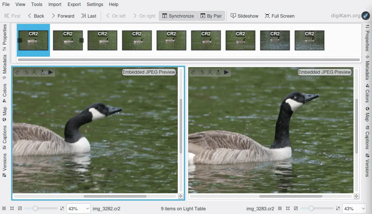 Screencast da Mesa de Luz digiKam usando o modo Por par com visualizações lado a lado¶