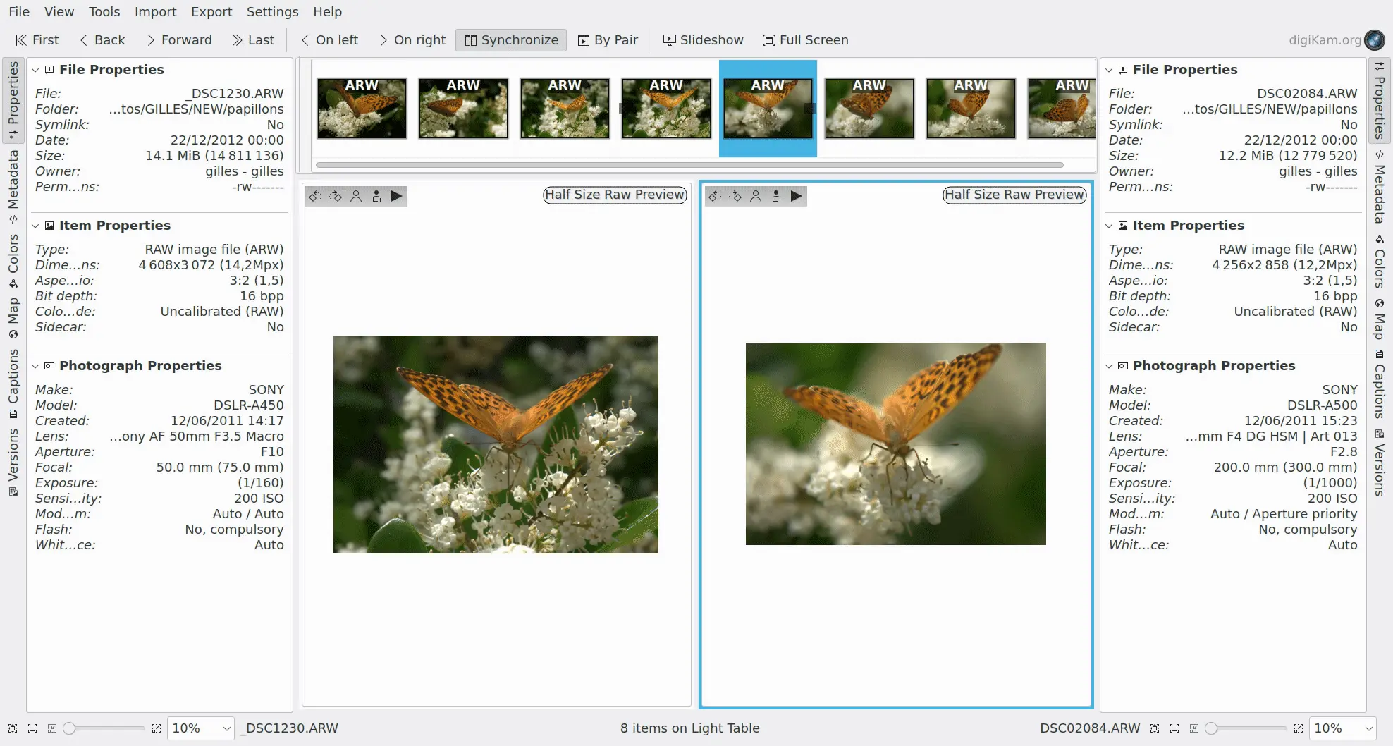 Com o modo por par desativado, quaisquer duas imagens podem ser comparadas arrastando a primeira imagem da barra de miniaturas para o painel de comparação esquerdo e, em seguida, a segunda imagem para o painel de comparação direito. Uma pequena seta indicará qual cópia é exibida em qual painel. O painel selecionado no momento será destacado por uma moldura. Se as duas imagens tiverem a mesma proporção e você escolher Sincronizar na barra de ferramentas, qualquer zoom e deslocamento em uma janela serão executados de forma síncrona no outro painel. Isso permite comparar facilmente as mesmas áreas nas duas imagens.