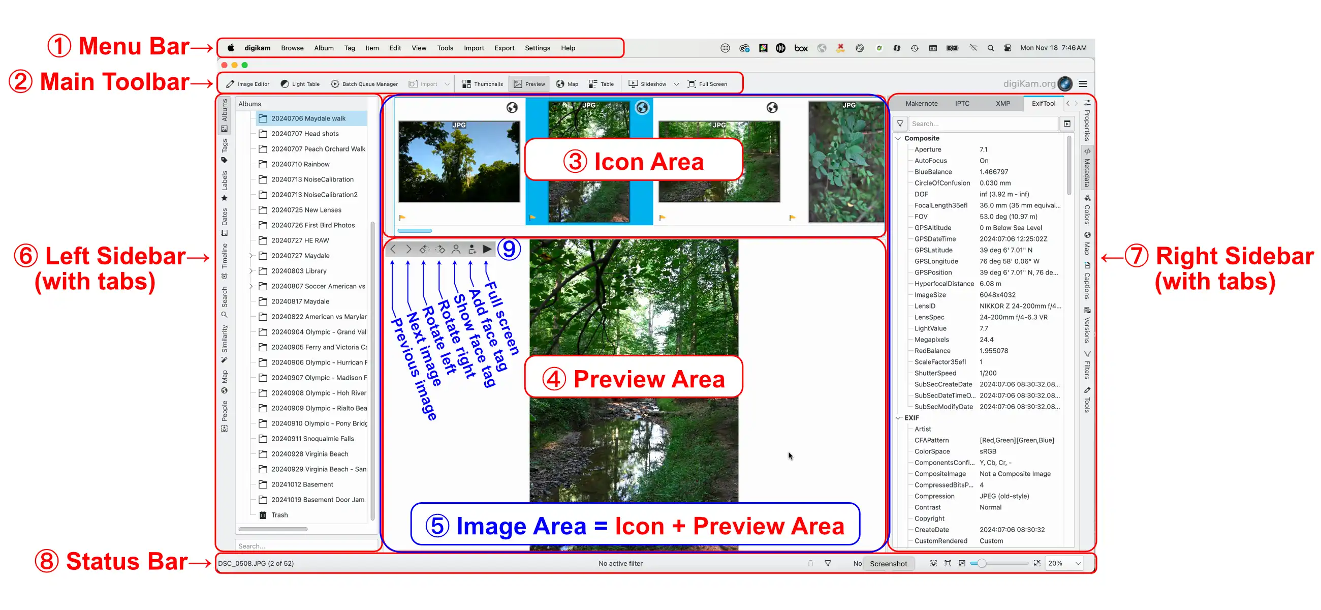 A área da imagem no centro é cercada pela barra de menu ① e a barra de ferramentas principal ② na parte superior, a barra de status ⑧ na parte inferior, bem como a barra lateral esquerda ⑥ e Barra lateral direita ⑦. A barra lateral esquerda permite alternar entre nove “Vistas”: Álbuns (mostrados aqui), Etiquetas, Rótulos, Datas, Linha do tempo, Pesquisa, Semelhança, Mapa e Pessoas. A barra lateral direita pode ser usada para mostrar informações sobre suas imagens, aplicar filtros para selecionar imagens e selecionar ações a serem aplicadas a imagens selecionadas. Você pode usar todas essas visualizações para organizar e encontrar suas fotografias. Você pode recolher ou expandir as áreas da barra lateral clicando nas abas da barra lateral.