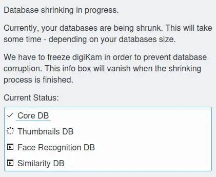 A última opção leva à limpeza estendida (encolhimento) dos bancos de dados. Esse tipo de limpeza é suportado tanto pelo SQLite quanto pelo MySQL. A limpeza do banco de dados pode levar algum tempo. Para evitar a corrupção do banco de dados durante esta operação, o digiKam exibirá a seguinte caixa de diálogo não modal e deixará de responder aos comandos do usuário até que a operação de limpeza seja concluída.