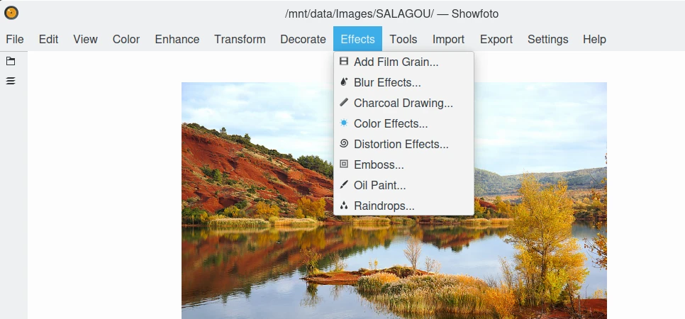 O menu Showfoto é praticamente o mesmo que o menu do Editor de Imagem do digiKam. Há algumas diferenças nas entradas Arquivo, Configurações e Ajuda devido à falta de suporte a bancos de dados.