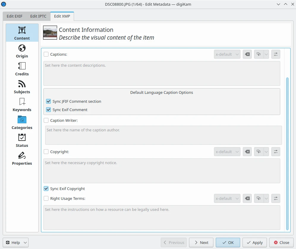 O digiKam permite sincronizar algumas entradas específicas de metadados de um bloco para outro. Por exemplo, comentários estão disponíveis em Exif, IPTC e XMP como entradas separadas. Marque as caixas de seleção Sincronizar… correspondentes às entradas que deseja copiar de um formato para outro.