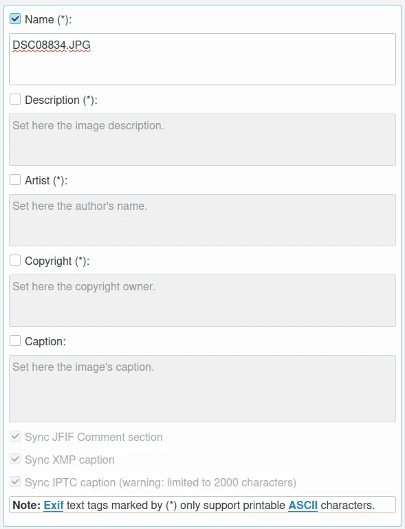 A sincronização de metadados pode produzir resultados indesejados porque o Exif é limitado ao conjunto de caracteres ASCII.