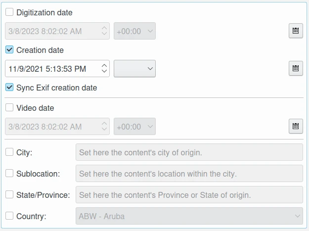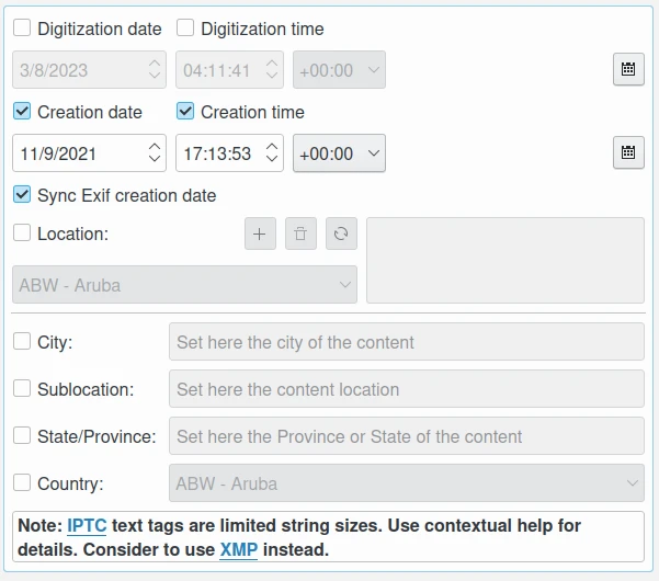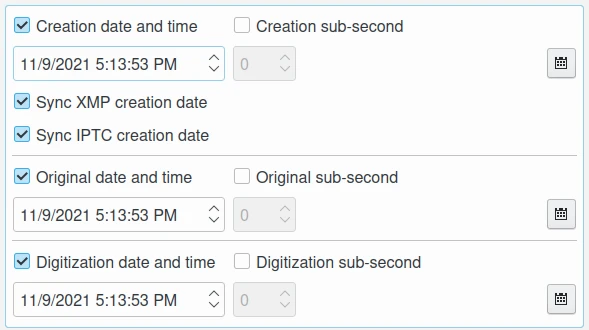 Data e hora de criação: esta caixa de seleção permite editar a data e a hora de criação da imagem. É a data e a hora correspondentes ao carimbo de data/hora em que o arquivo foi alterado. Use o widget do editor de calendário na parte inferior para selecionar o carimbo de data/hora e o botão à direita para redefinir o carimbo de data/hora para a data atual do seu computador. Este último pode ser sincronizado com a data de criação do XMP e a data de criação do IPTC.