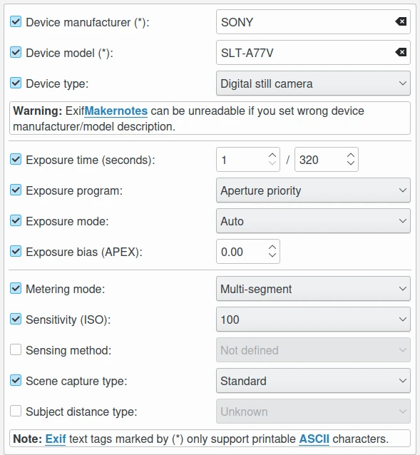 Notas do fabricante do Exif pode ficar ilegível se você definir a descrição errada do fabricante/modelo do dispositivo.